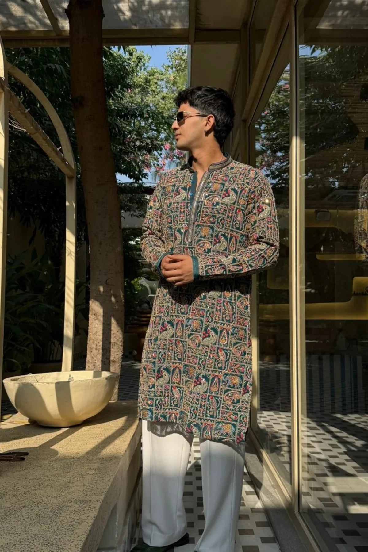 • PEACOCK ARTISTRY KURTA – TURQUOISE GREEN| PAIRED WITH LUXURY KOREAN PANTS